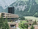 Wie ein kleines, abgelegenes Bergdorf ist das Areal in architektonisch höchstem Niveau angelegt. 41 Chalets aus Holz sprießen auf einem Betonsockel wie Pilze im Wald rund um den langgezogenen vierstöckigen Hotelbau mit seinem Turm, der ähnlich wie der Blauspitz hinter ihm, tiefschwarz in den Himmel ragt. Design trifft Natur.